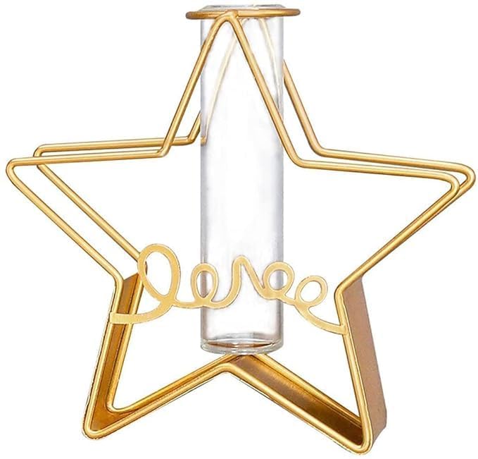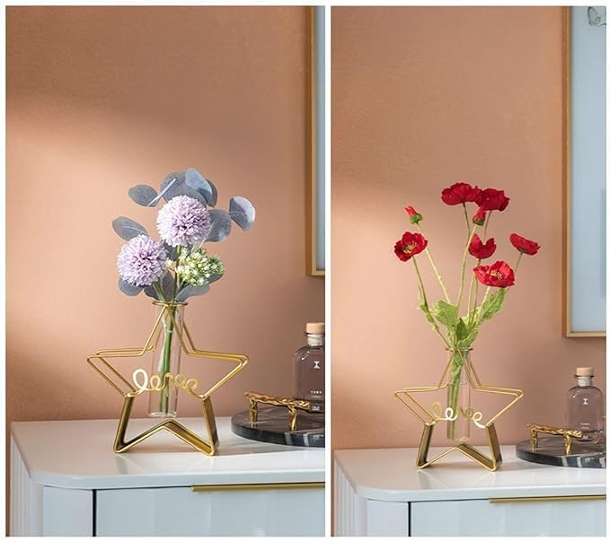 Desktop Plant Vases with Test Tube Glass Flower Vase with Gold Metal Stand Propagation Station Plant Holder for Home Wedding Decor(Star Shape Flower Pot Without Flower)